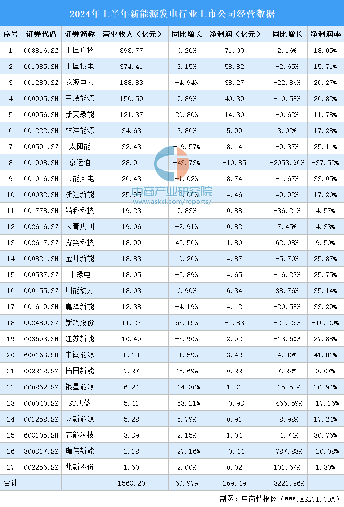 中商情报网讯:2024年上半年,新能源发电行业27家上市公司合计实现营收1563.20亿元,同比增加60.97%;合计净利润269.49亿元暖暖视频韩国完整版电视jc710公海赌船,同比减少3221.86%。其中,营收前十的公司分别为中国广核、中国核电、龙源电力、三峡能源、新天绿能、林洋能源欢迎来到公海,、太阳能暖暖视频韩国完整版电视、京运通、节能风电暖暖视频韩国完整版电视、浙江新能。
